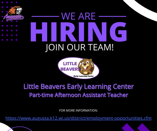 Little Beavers Early Learning Center is looking for a part-time afternoon Assistant Teacher. For more details and to apply: https://www.augusta.k12....