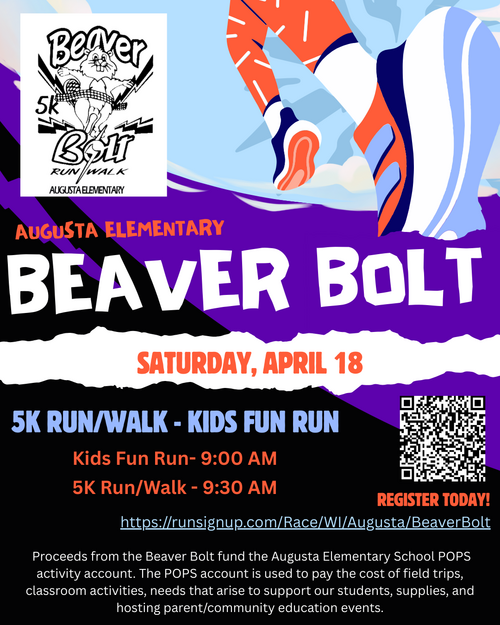 Registration for the 11th Annual Beaver Bolt is NOW OPEN! Make plans to join us for this fun, family-friendly event benefiting Augusta Elementary...