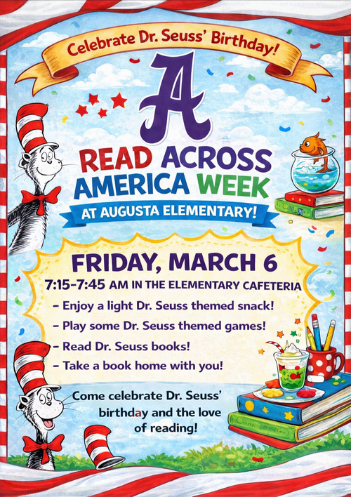Join us as we celebrate Read Across America Week at Augusta Elementary! 📚🎉 In honor of Dr. Seuss’ birthday, we’re inviting students and their fam...