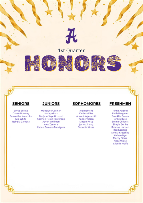 We are excited to announce our High School 1st Quarter Honors recipients! To earn this distinction, students must achieve a GPA of 3.0–3.66 for the quarte...
