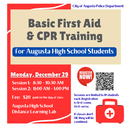The City of Augusta Police Department is offering a CPR & Basic First Aid Class for high school students during Christmas Break! Gain life-saving skills and...