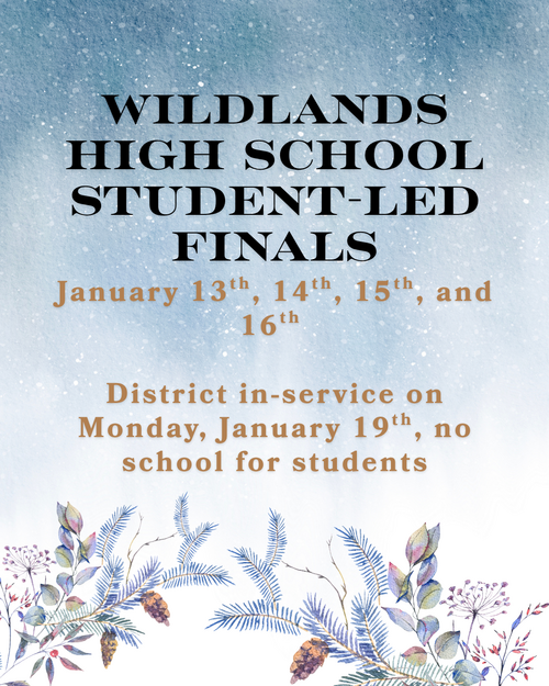 Wildlands High School student finals will take place on January 13th, 14th, 15th, and 16th. More information about finals will be emailed to families. Monday, J...